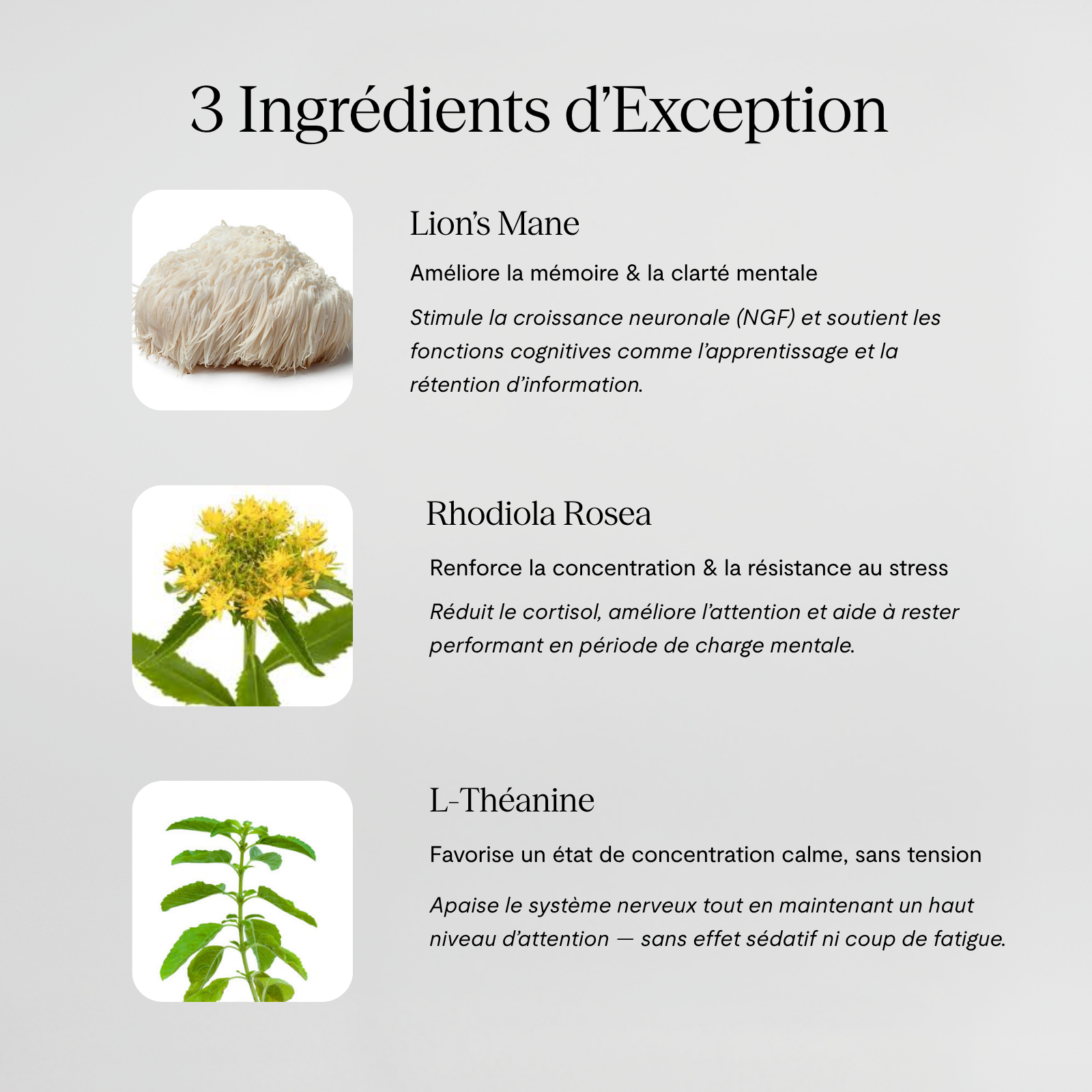 🌿 100% Naturel & Clean – Fabriqué avec des doses cliniquement efficaces de lion's mane, de rhodiola rosea et de L-théanine. Sans agents de remplissage, sans sucre, sans produits chimiques artificiels.