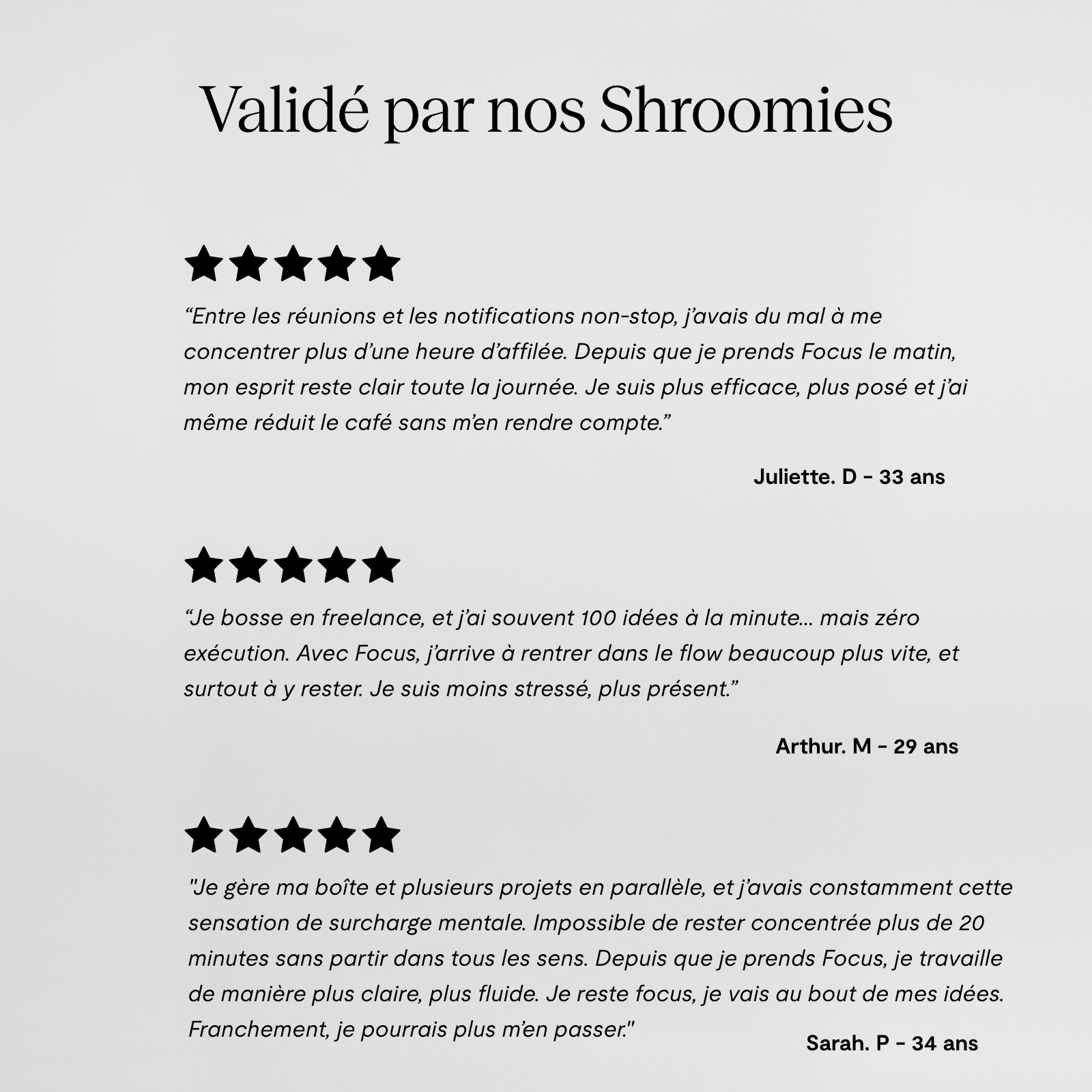 🧠 FOCUS est le nouveau meilleur ami de votre cerveau – un puissant mélange de lion's mane, de rhodiola rosea et de L-théanine conçu pour aiguiser la concentration, améliorer la clarté mentale et éloigner les distractions. Pas de baisse de régime, pas de brouillard cérébral: juste une concentration nette et soutenue pour des performances optimales.