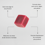 🍇 Goût Mûre – Un délicieux gummie à la mûre pour retrouver la sérénité. Pas de mélange, pas de préparation, il suffit de mâcher et de profiter de votre journée sans stress.