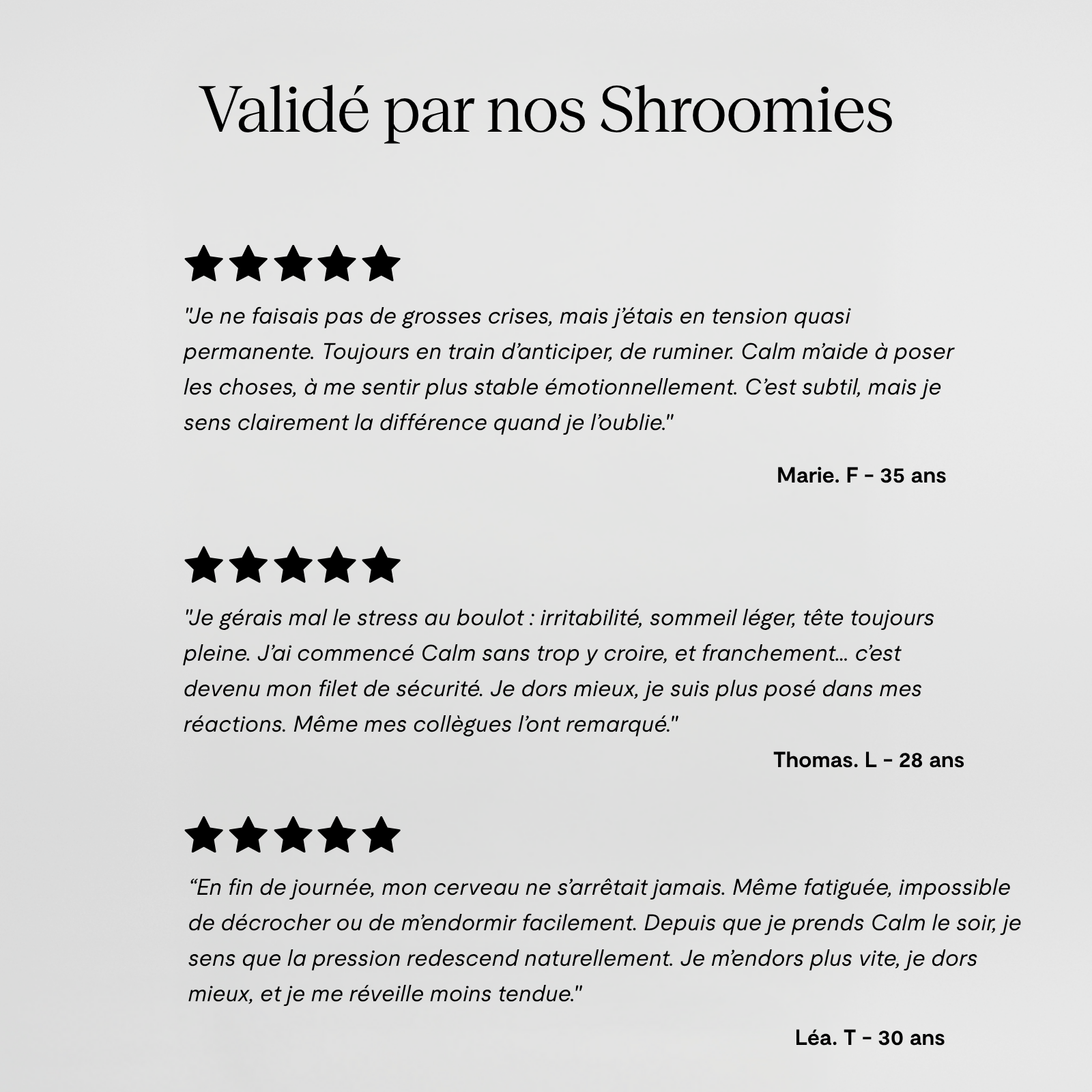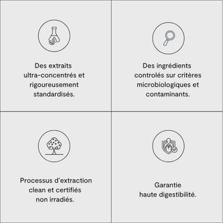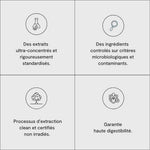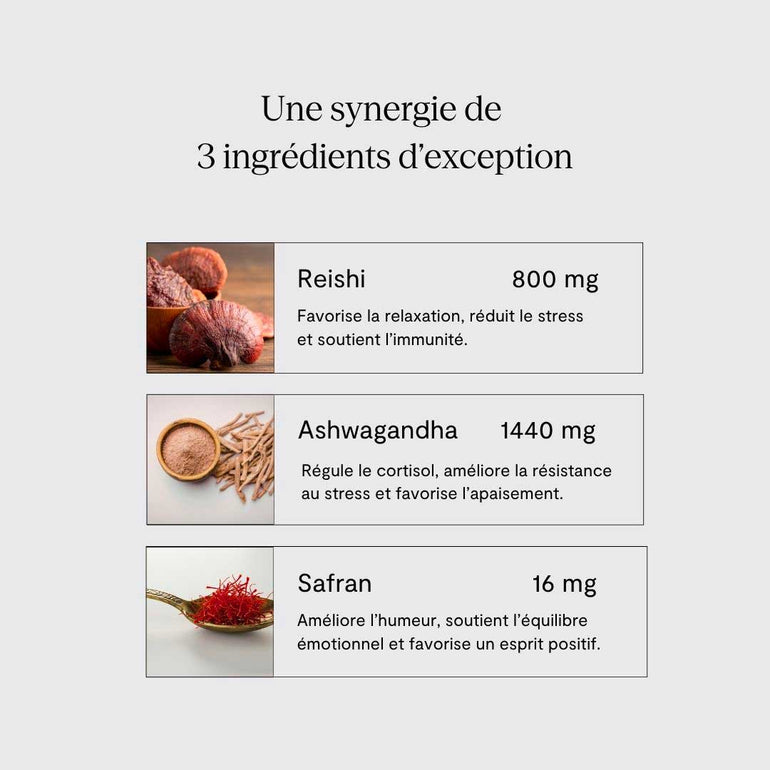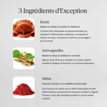 🌿 100% Naturel & Clean – Fabriqué avec des doses cliniquement efficaces de reishi, d'ashwagandha et de safran. Sans agents de remplissage, sans sucre, sans produits chimiques artificiels.