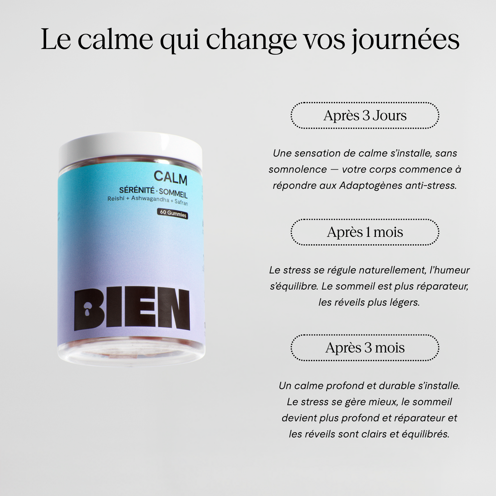 📆 Rituel quotidien, Résultats durables – Une utilisation réguliêre est essentielle pour des résultats optimaux. Intégrez CALM à votre routine pendant au moins 30 jours pour constater la différence.