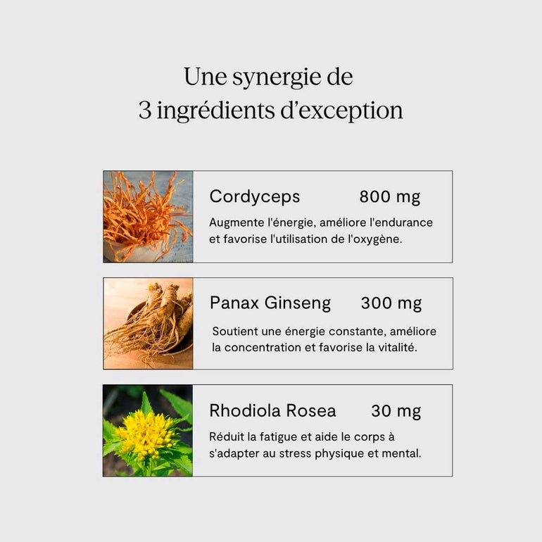 Des extraits de Cordyceps, Rhodiola et Panax Ginseng aux doses cliniquement efficaces pour favoriser la résistance à l’effort.